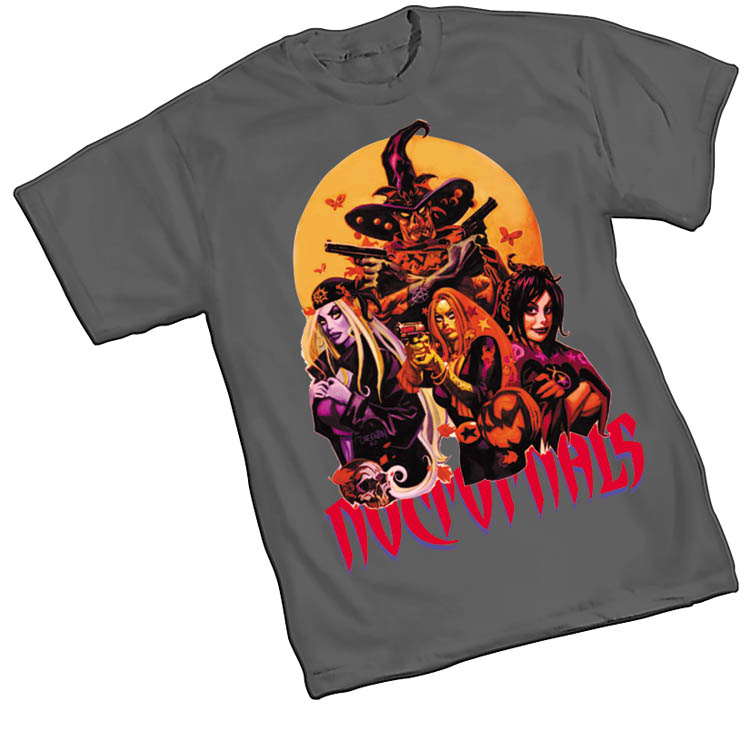 Nocs T-Shirts AvailableI GOT a box of the new Nocturnals shirts (right, click to see a bigger version) from Graphitti yesterday - they are AWESOME - its a 'batman' grey shirt (NOT OATMEAL OR HEATHER) and the art features Gunny, Eve, Star and Poly on the front. It has skulls, guns, leaves, moths, moons and stars (no clovers) and a jack o lantern. The Nocs logo in red and is sharp, man. If anyone's interested in snagging one, its not on their site yet, I don't think, but you can order by calling Graphitti: 1-800 699-0115 or just wait til they show up at a fine comics retailer near you, probably this week or the next, I'd imagine... DB Update - Graphitti Has Them On Their WebsiteAvailable from Graphitti Designs, this is available in comic shops, or directly from Graphitti Designs. Their website has a page for them in two ranges of size (the sizes below link direct to the page for each item) or you can phone Graphitti on: 1-800 699-0115Price: $17.95 (S-XL)/$20.95 (XXL) |