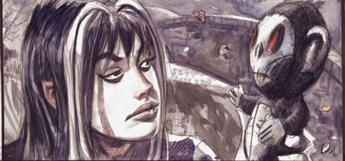 Greetings everyone! its cold and snowy here at home, and Im rushing to get off a batch of batgirl pages I just finished. the Midnight Companion Sourcebook is still in the productions stages, but the work coming in from the various artists is really sweet. The hardcover companion guide to the Nocturnals is 'art-heavy' and something no Nocs fan need miss, I assure you,. especially if you want to see the Nocs battle their new enemy , Rictus and his gang... very cool stuff! Look for NOCTURNALS: A MIDNIGHT COMPANION in stores in March.